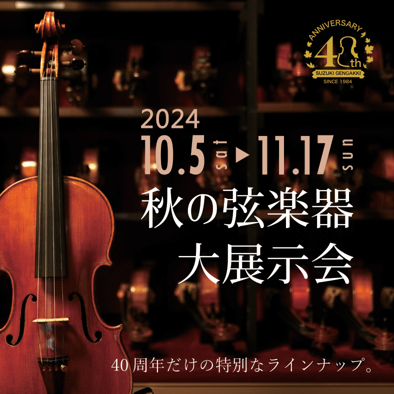 <40周年記念 弦楽器大展示会のご案内> おかげさまで鈴木弦楽器は2024年9月で設立から40周年を迎えることができました。 これも皆様の変わらぬご愛顧の賜物とスタッフ一同、心より感謝致しております。 そこで、40週年を記念し10月5日から11月17日にかけ... -
